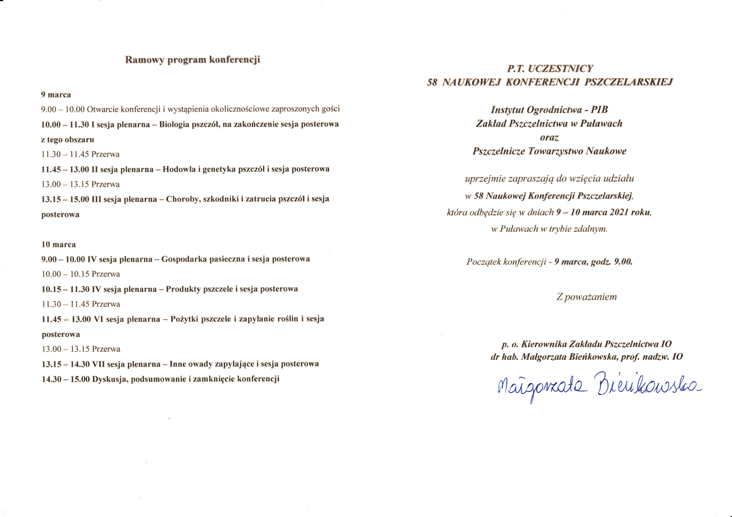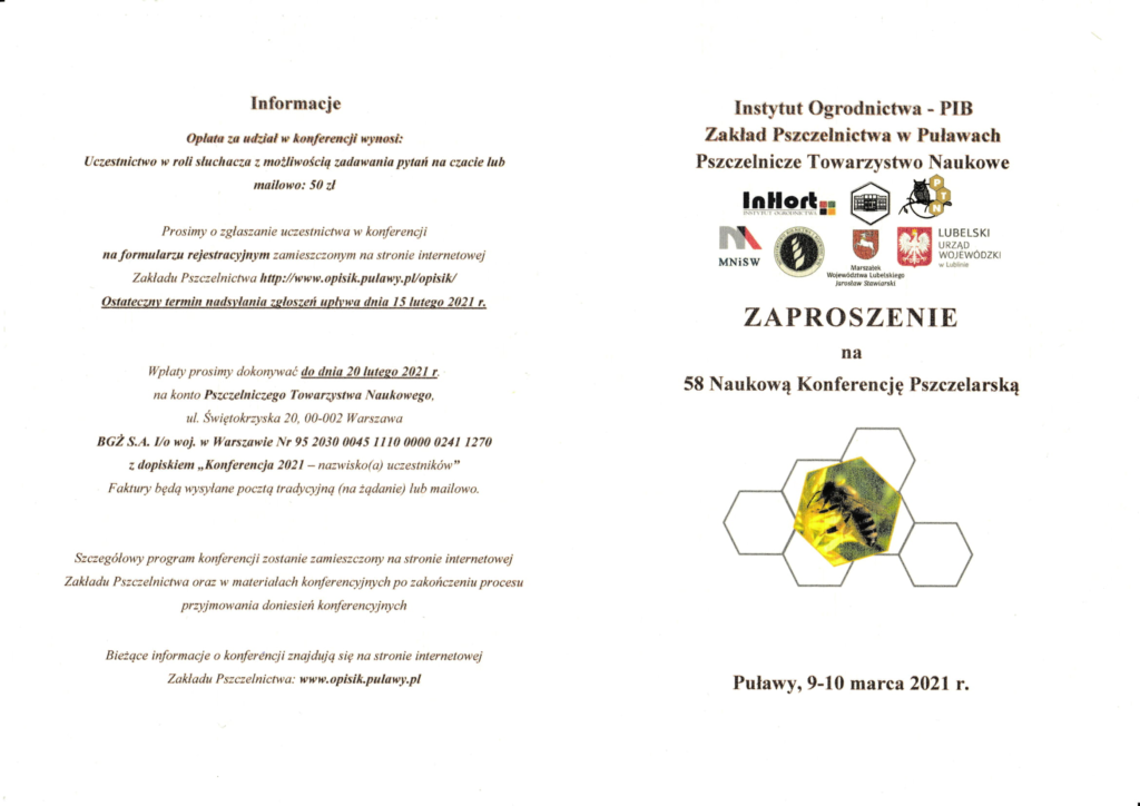 58 Naukowa Konferencja Pszczelarska (On-line) 30 stycznia 202130 stycznia 2021 adminBez kategorii Instytut Ogrodnictwa – Państwowy Instytut Badawczy, Zakład Pszczelnictwa w Puławach oraz Pszczelnicze Towarzystwo Naukowe zaprasza do udziału w 58 Naukowej Konferencji Pszczelarskiej On-line, organizowanej w dniach 9-11 marca 2021r.