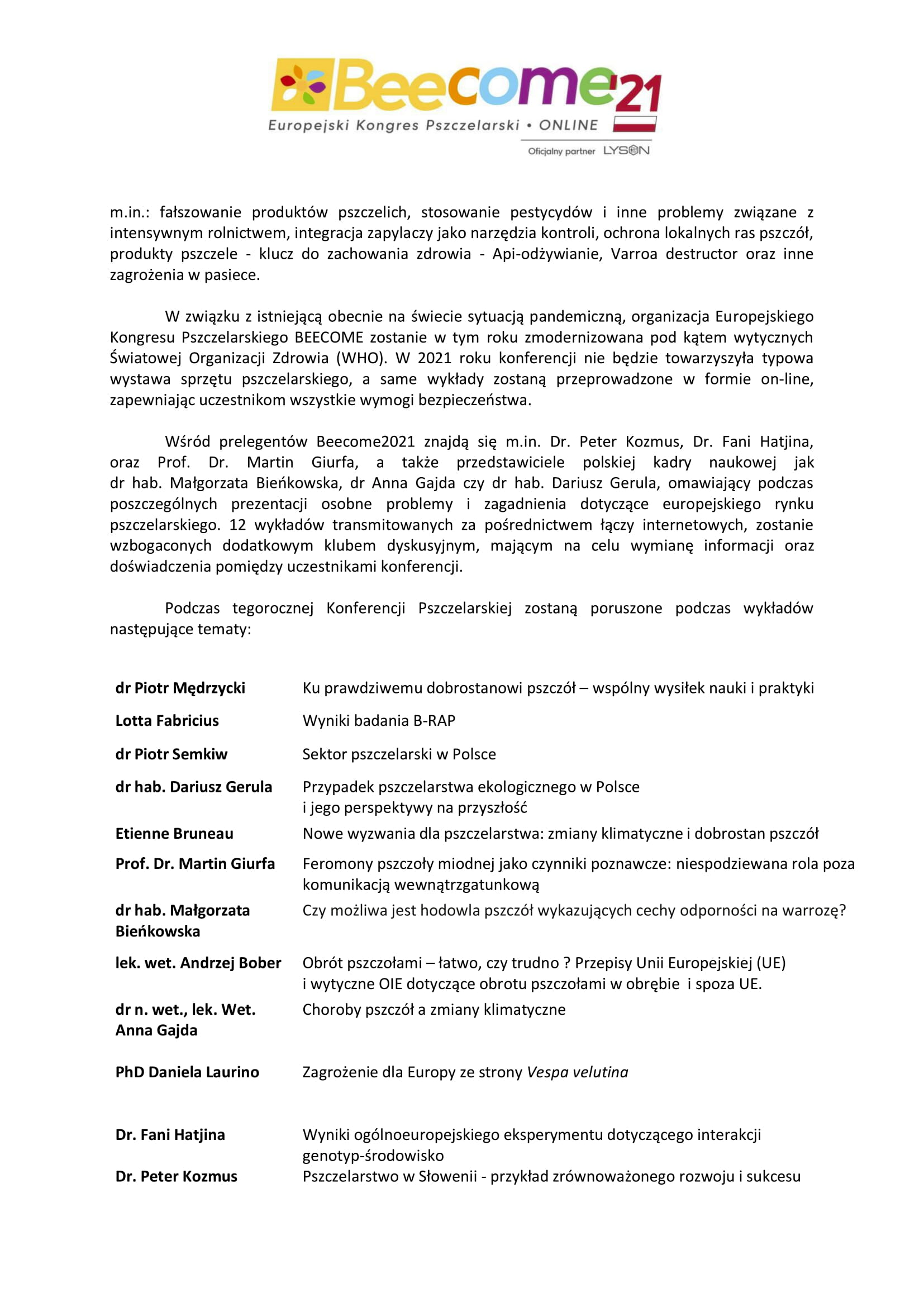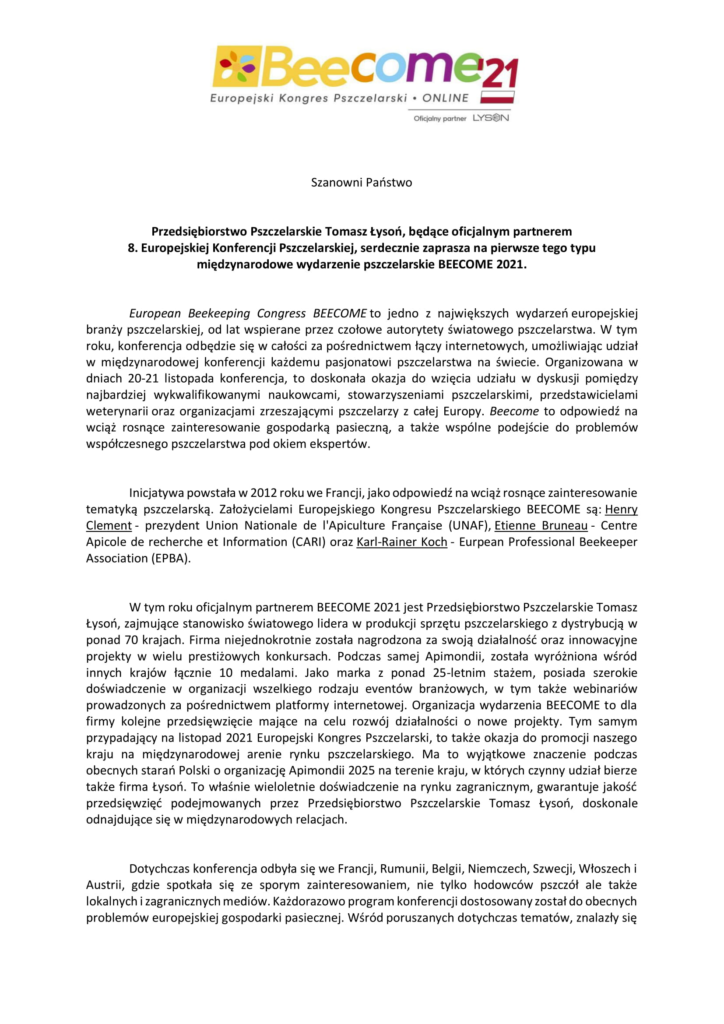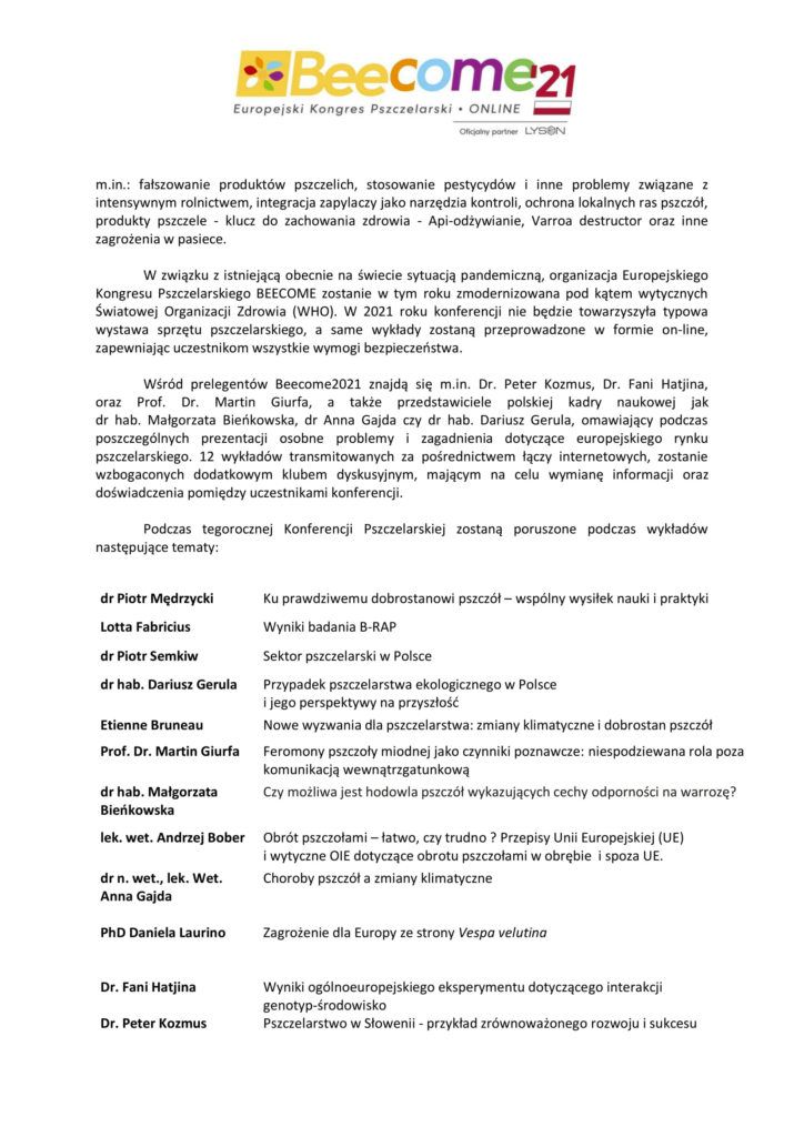20-21 listopada 2021 odbędzie się w całości w wersji ONLINE Europejska Konferencja pszczelarska BEECOME 2021