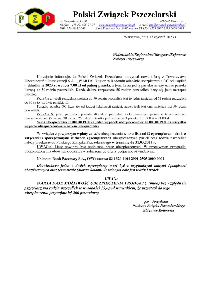 Oferta ubezpieczenia OC na 2023/2024 22 stycznia 202322 stycznia 2023 adminBez kategorii PZP otrzymał od TUiR S.A. WARTA ofertę na ubezpieczenie OC na 2023/2024r Obowiązujące dokumenty i tabele do pobrania poniżej. Załącznik nr 2 do oferty – pobierz Warunki ubezpieczenia – pobierz Tabela – wykaz pasiek z adresami – pobierz