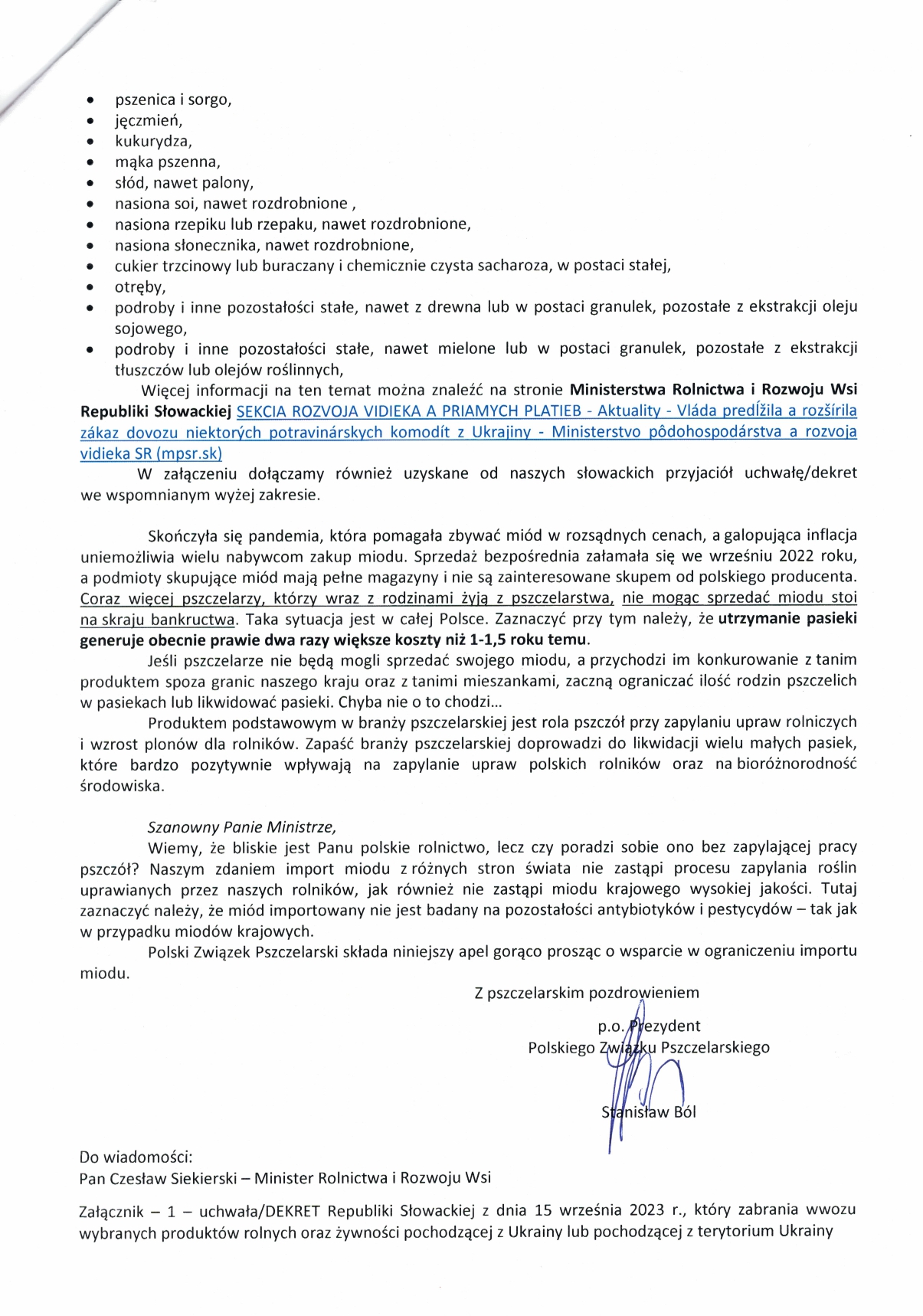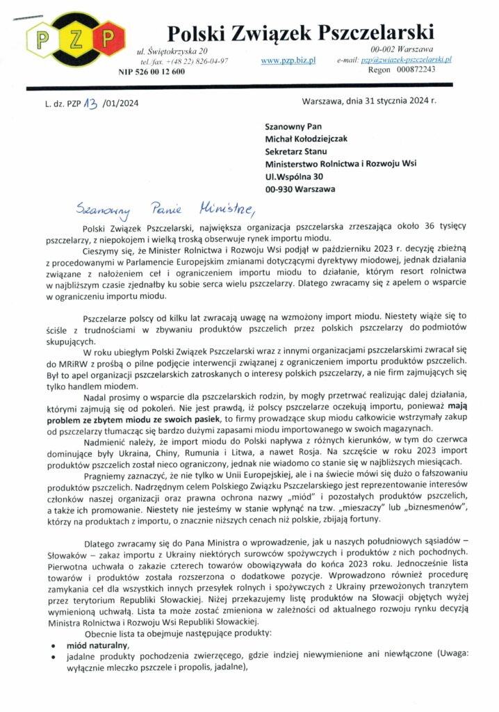 Zarząd Polskiego Związku Pszczelarskiego od grudnia czeka na wyznaczenie terminu spotkania zarówno z ministrem Siekierskim, jak i z ministrem Kołodziejczakiem w celu omówienia najważniejszych problemów pszczelarskich, w tym tematu rynku miodu i pomocy dla pszczelarzy.