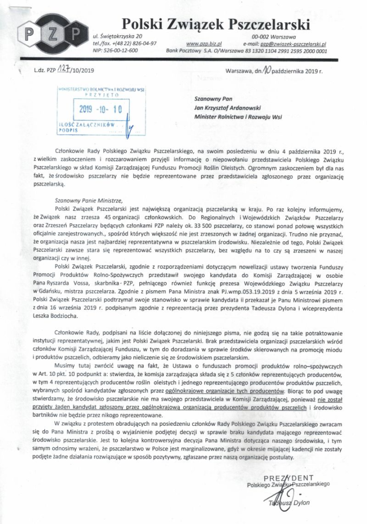 Po raz kolejny Minister Rolnictwa i Rozwoju Wsi Krzysztof Ardanowski ignoruje pszczelarzy i marginalizuje pszczelarstwo jako bardzo ważną dziedzinę gospodarki.