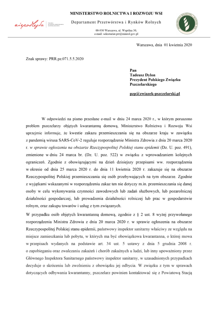 Poniżej pismo Ministerstwa Rolnictwa i Rozwoju Wsi w zakresie przemieszczania się pszczelarzy.