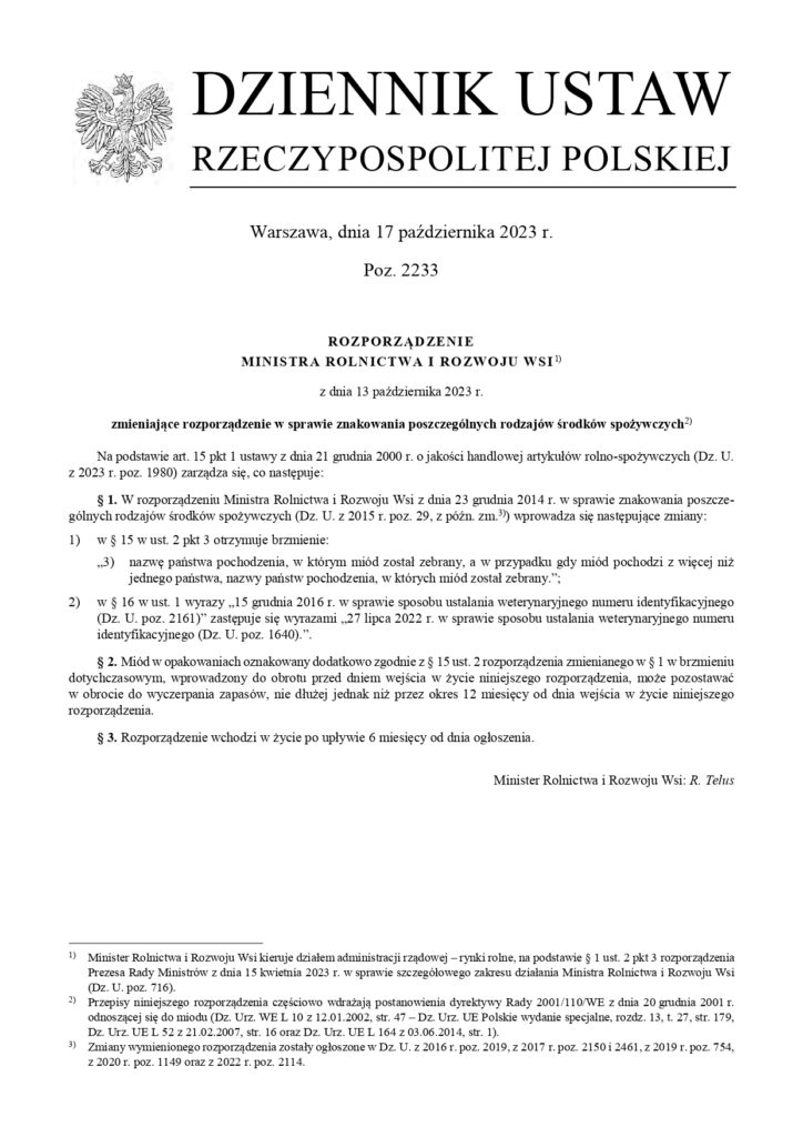 W życie wchodzi rozporządzenie Ministra Rolnictwa i Rozwoju Wsi w sprawie znakowania poszczególnych rodzajów środków spożywczych – rozporządzenie dotyczy miodu z importu (rozporządzenie z 13 października 2023 r., opublikowane 17 października 2023 r. w DZ.U. nr 2233).
