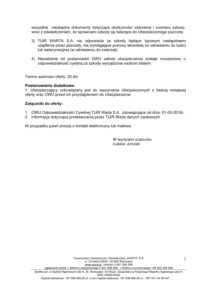 Poniżej otrzymana oferta z TU WARTA