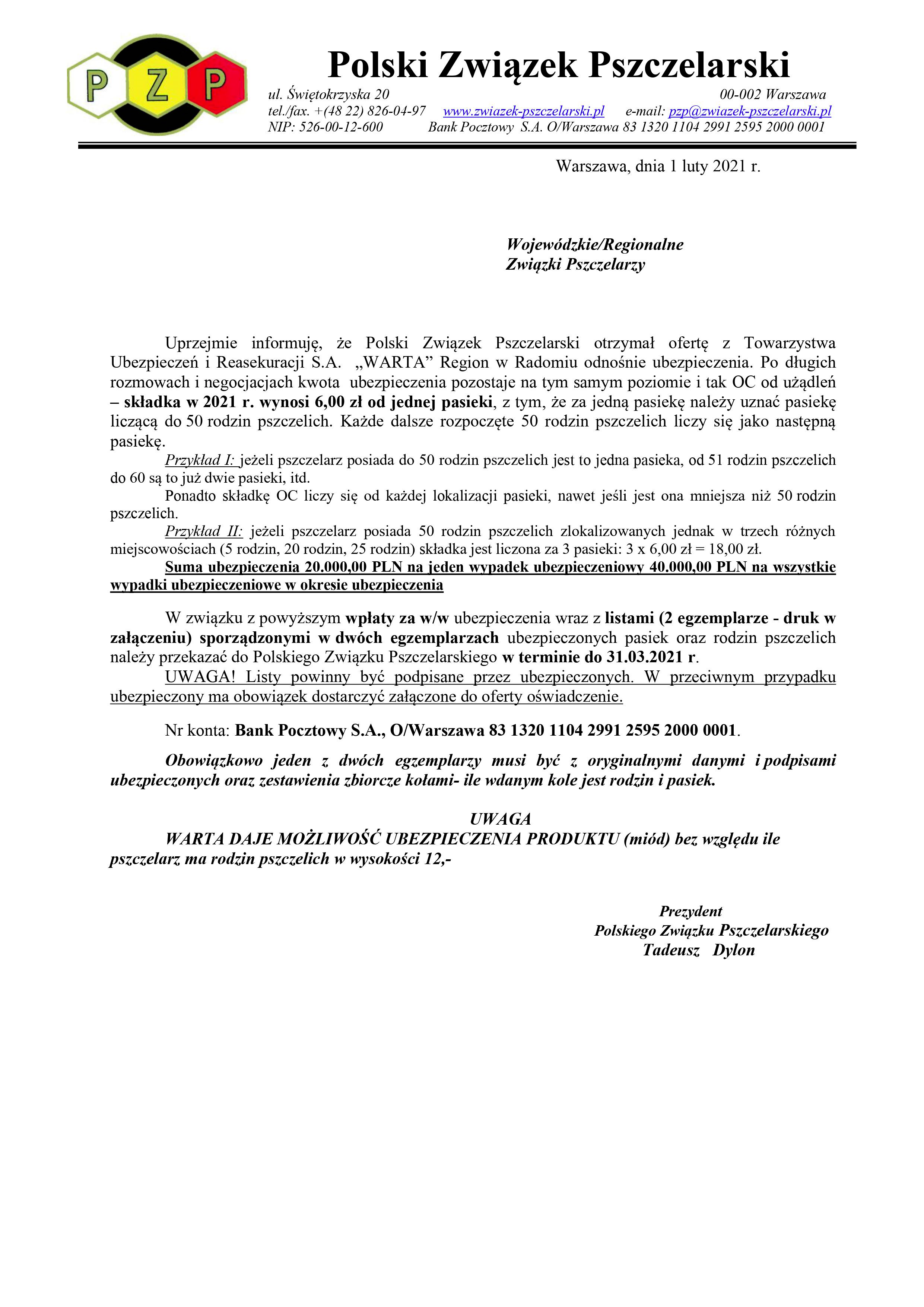 Oferta ubezpieczeń TUiR S.A. WARTA pasiek na lata 2021/2022. Pod pismem z PZP znajdują się odnośniki do wszystkich obowiązujących dokumentów. Uwaga obowiązuje nowa tabela (załącznik).